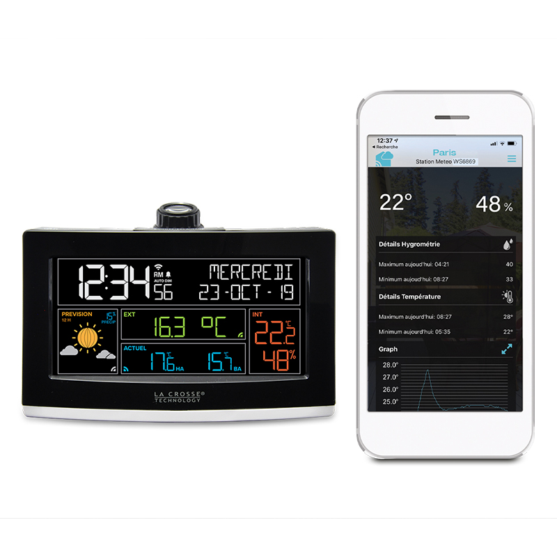 - POSSIBILITE DE CONNEXION WIFI AVEC L’APPLICATION LA CROSSE VIEW PERMETTANT D’AFFICHER SUR L’ECRAN LES PREVISIONS METEO, TEMPERATURE EXTERIEURE ET PROBABILITE DE PLUIE SUPPLEMENTAIRES